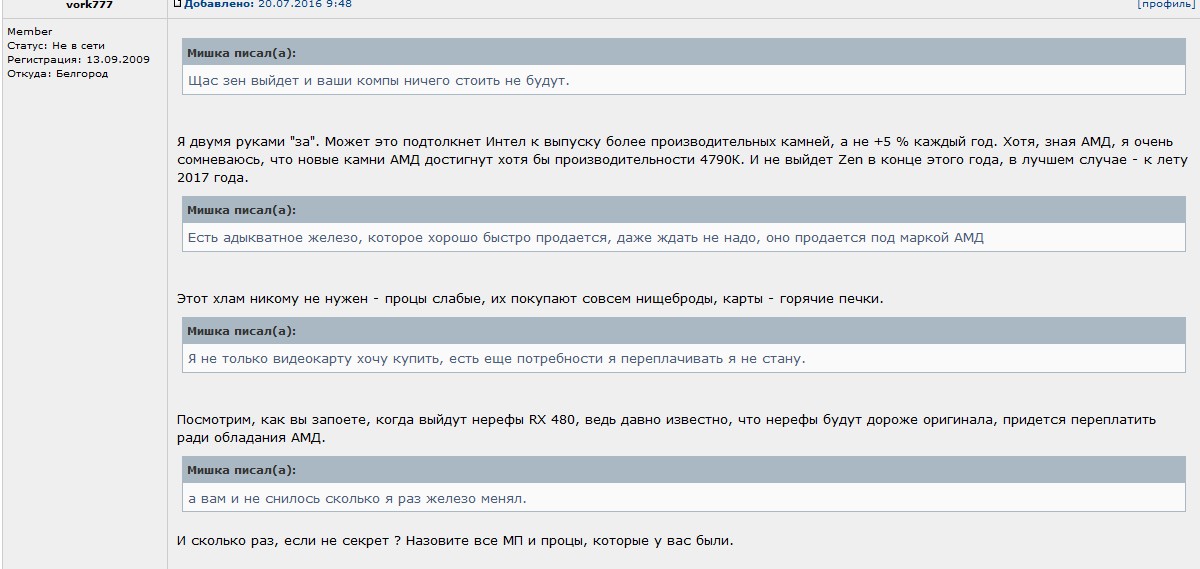 На АМД если вначале камень продают, покупают быстрее, потом связку целую продают с небольшой скидкой. Материнская плата за время эксплуатации отрабатывает все потраченные деньги на 100%, ее продать можно за 2,5 - 3 р, а на 970 сокете продают за 4 тысяч. А интел, когда ты захочешь сменить камень через три года ты не увидишь ни камней ни матерей на этом сокете, да да прийдется менять и мать и проц и память. Все что ты копил на видеокарту будет потрачено на процессор и мать. Когда те кто кто покупали АМД будут все лето играть и наиграются, а ты все лето будешь копить на видеокарту а там пора в школу, когда на АМД уже дети отыгрались все лето учатся на пятерки а такой двоешник как ты потратился на интел, играл только касынку и пасьянс раскладывал все лето. Когда нормальные дети играли во все. С интелом надо иметь большой кошелек. И чтобы думать купить интел у тебя в кармане должно быть 80 тысяч или что ты их будущем заработаешь, а как же семья, девушка дети, машина? Все день скушал твой пк!!!! И ты снова не поиграл потому что у тебя интел, денег снова нет, снова кредит и дошираки. На АМД все играют. Зачем тратить много купи приставку и играй во все, стоит 28 тысяч. Тебе ни монитор больше ничего не надо будет ни стол и стул для игр. Пусть тебя интел нагревает твои карманы.