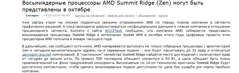 Когда, и каким-бы, это "новое" от АМД ни было, это опять будет модульное УГ, да ещё и на новом сокете. Даже не представляю, кто это купит себе домой, не говоря уже про игрунов. Надо быть неадекватом чуть менее, чем полностью. Лично я окончательно, и бесповоротно, похоронил АМД.Пару последних лет у меня был древнейщий phenom ii x4 965, в разгоне до 4.0, с ноября прошлого года мне на халяву достался fx8320, пользовался до середины января этого года. Скажу так - этот шлак ещё хуже чем phenom. Продал дней 10 назад весь системник за 5 тыщ. рублей (видеокарту всунул 7770) оставив себе старую, но бодрую 660. Больше АМД для меня не существует. Не возьму даже даром, ибо не за чем.