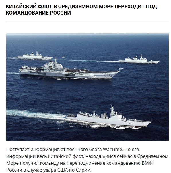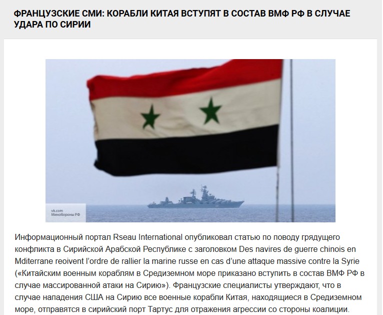 Информационный портал Rseau International опубликовал статью по поводу грядущего конфликта в Сирийской Арабской Республике с заголовком Des navires de guerre chinois en Mditerrane reoivent l’ordre de rallier la marine russe en cas d’une attaque massive contre la Syrie («Китайским военным кораблям в Средиземном море приказано вступить в состав ВМФ РФ в случае массированной атаки на Сирию»). Французские специалисты утверждают, что в случае нападения США на Сирию все военные корабли Китая, находящиеся в Средиземном море, отправятся в сирийский порт Тартус для отражения агрессии со стороны коалиции.