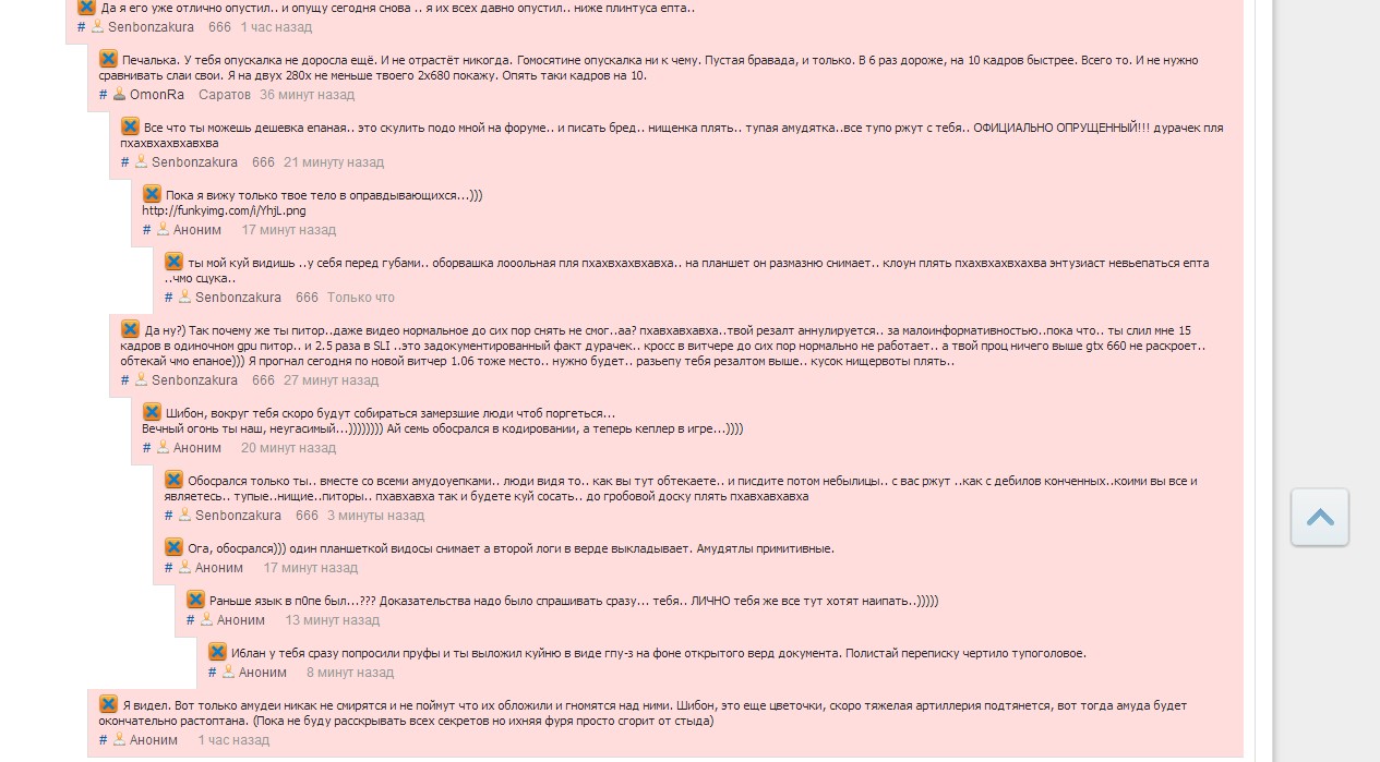 Мразь шибанутая дождётся когда ему фанат АМД бросит кирпич на голову!!! Тварь хватит издеваться над нами последнее предупреждение!!!