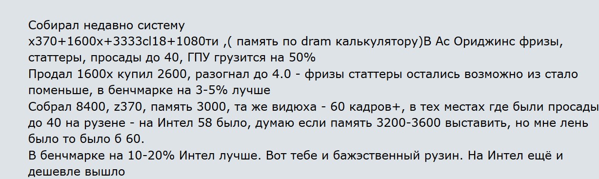Амд сырой.. убогий мусор..даже через год..когда этот немощный кукурузен допилили прошивками ..до состояния хоть как-то запускает игры.. он все равно мусор.. при прямом сравнении с 3930К 4.5 VS 2700x 4.2 последний сливает от 25 до 40 процентов везде практически.. и самое главное фризы и статтеры устранить невозможно..даже с памятью 3533 мгц